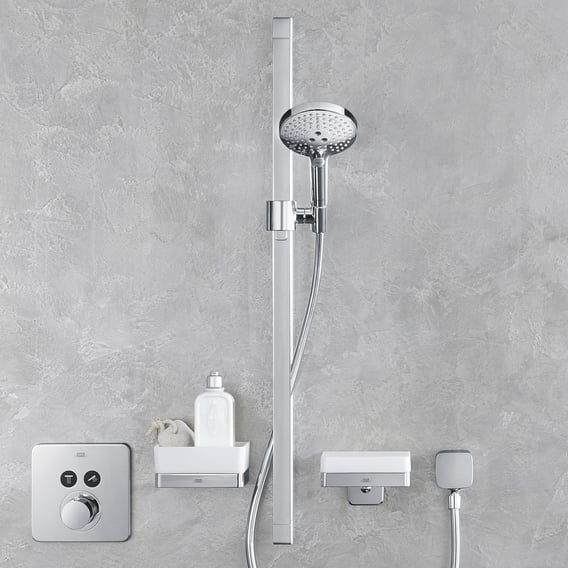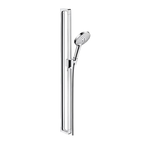 Deze AXOR Citterio E glijstangset met garnituur biedt drie straalsoorten en heeft een hoogte van 1009 mm in chroom. De handdouche Raindance Select S 120 biedt drie straalsoorten: Rain, een gelijkmatige en zachte straal; RainAir, een met lucht verrijkte, extra zachte straal; en Whirl, een intensieve, roterende straal. De straalsoorten kunnen eenvoudig worden aangepast met een druk op de knop dankzij de Select-functie. De AirPower-technologie zorgt voor volle, zachte druppels door met lucht verrijkt water. De grote douchekop biedt een optimale waterverdeling dankzij de XXL Performance. De interne, aparte watergeleiding beschermt de chroomoppervlakte. Kalkafzettingen op de siliconen sproeiers kunnen eenvoudig worden verwijderd door erover te wrijven met de QuickClean-functie. De set bevat een uitspoelbaar vuilfilter. De handdouche heeft een diameter van 125 mm. De douchestang wordt geleverd met een Isiflex doucheslang die knikbestendig, flexibel, eenvoudig te reinigen en voorzien is van een verdraaiingsbescherming. De lengte van de doucheslang is 1600 mm. De hoogte van de douchestang is 1009 mm, met een boorafstand van 915 mm en een afstand van 50 mm tussen de voorste en achterste douchestang.