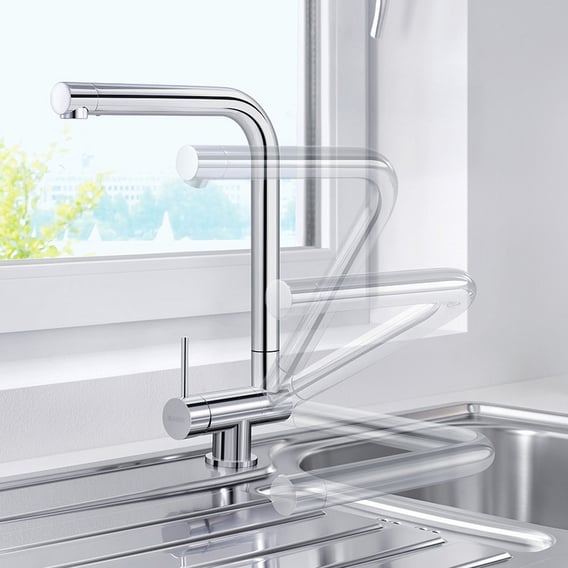 Deze Blanco LARESSA-F venstermengkraan chroom – haakse draaibare uitloop met keramische schijven 521546 is speciaal ontworpen voor montage voor een venster. Hijlichaam kan eenvoudig opzij worden geklapt om het venster te openen, dankzij het klapmechanisme. De straal is een zachte, met lucht verrijkte parelstraal, wat zorgt voor een aangename waterervaring. Hij is uitgerust met een soepel werkende keramische cartouche en heeft een draaibare uitloop met een draaibereik van 360 graden. Het uiteinde van de uitloop is draaibaar en voorzien van een luchtinlaat voor een goed gevormde waterstraal. Deze kraan maakt het gemakkelijk om water te gebruiken, zelfs bij hoge vaten. De meegeleverde stabilisatieplaat zorgt voor verbeterde stabiliteit bij montage met roestvrijstalen spoelbakken. Hij is voorzien van flexibele aansluitslangen en heeft een duurzame, eenvoudig te reinigen chromen afwerking. De bedieningshendel bevindt zich aan de linkerkant.