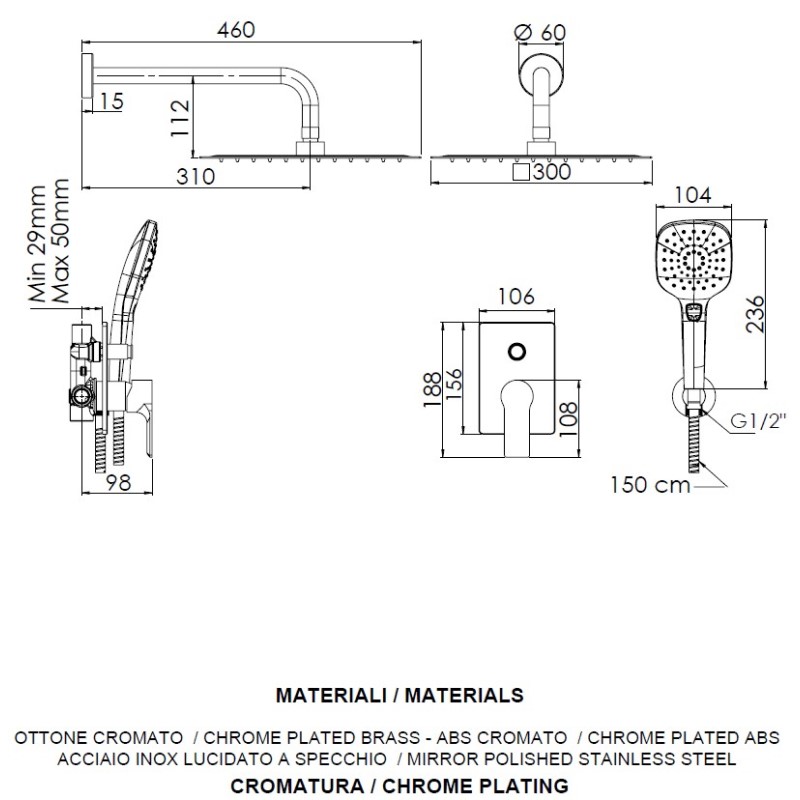 - Materiaal: messing voor de hoofddouche en muurdouchearm