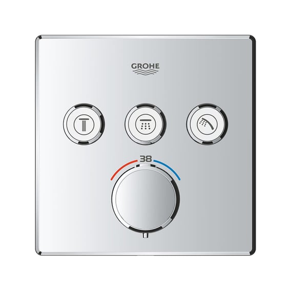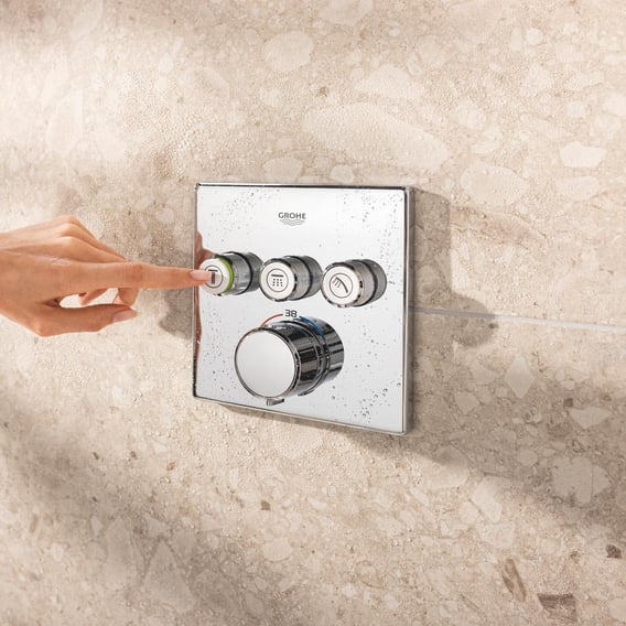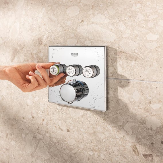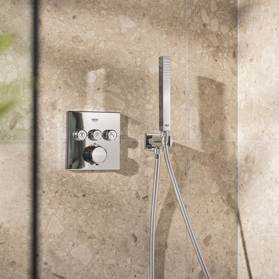 Deze Grohe Precision SmartControl thermostatische inbouw regendoucheset met EcoJoy 310 x 310 mm chroom 34875000 biedt een geavanceerde douche-ervaring met zijn innovatieve functies en kwalitatieve materialen. De Hoofddouche Vitalio SmartActive 310 met douchearm biedt twee straalsoorten: PureRain voor een gelijkmatige, extra zachte straal en ActiveRain voor een krachtige straal, ideaal voor het wassen van haar. De straalsoorten kunnen eenvoudig worden aangepast met een druk op de knop dankzij de One-Click Showering functie. De GROHE DreamSpray® technologie zorgt voor een gelijkmatige waterverdeling over alle actieve sproeiers, terwijl kalkafzettingen eenvoudig kunnen worden verwijderd door licht te wrijven over de SpeedClean siliconen sproeiers. De duurzame chromen afwerking is eenvoudig te reinigen dankzij GROHE StarLight®. Met de GROHE EcoJoy® technologie bespaart u water zonder in te boeten op doucheplezier. De douchearm heeft een uitlading van 400-430 mm. De handdouche Joy Cube Stick met doucheslang biedt een Rain straal voor een gelijkmatige, zachte waterstraal en maakt gebruik van dezelfde DreamSpray® en SpeedClean technologieën. De knikvrije, flexibele doucheslang van 1500 mm is eenvoudig te reinigen en voorzien van een TwistFree verdraaiingsbescherming. De Precision SmartControl thermostaat met geïntegreerde douchehouder en wandaansluitboog is geschikt voor drie gebruikers en maakt het mogelijk om meerdere gebruikers tegelijkertijd te activeren. De waterhoeveelheid kan worden geregeld door te draaien aan de SmartControl knoppen, die ook verwisselbare symbolen hebben. De ProGrip knoppen maken het mogelijk om de watertemperatuur en -hoeveelheid eenvoudig in te stellen. De GROHE TurboStat® technologie zorgt voor een constante watertemperatuur, zelfs bij schommelende waterdruk. De SafeStop functie biedt een veiligheidsslot bij 38 °C om te beschermen tegen per ongeluk te hoge temperaturen, met een extra optie om de maximale temperatuur te beperken tot 43 °C met SafeStop Plus. De set bevat een geïntegreerde wandaansluitboog en douchehouder, evenals een snelmontagesysteem met GROHE QuickFix®. De Rapido Smartbox basis voor het thermostaat heeft een inbouwdiepte van 75-105 mm, drie uitgangen (1/2 inch) en twee ingangen van onderen (1/2 inch), en is voorzien van een messing aansluitunit, voorgemonteerde afdichtstop, inbouwbox en bouwbeschermkap, met voorbereide bevestigingspunten voor zowel natte als droge bouw.