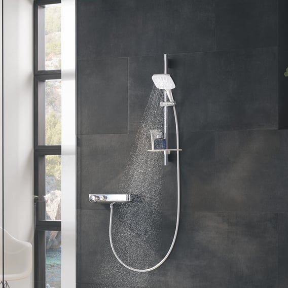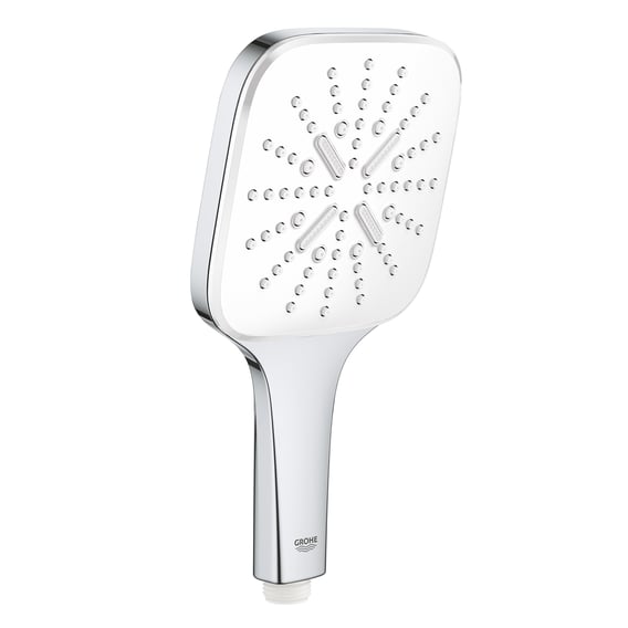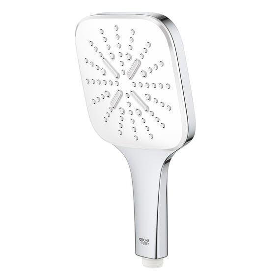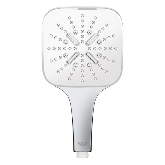 Deze Grohe Rainshower SmartActive Cube Handdouche 3 straalsoorten chroom 26551LS0 biedt een rijke douche-ervaring met drie verschillende straalsoorten: Rain voor een gelijkmatige, zachte straal, ActiveMassage voor een pulserende, ontspannende straal, en Jet voor een gefocuste, ronde straal. Dankzij de GROHE DreamSpray® technologie wordt het water gelijkmatig verdeeld over alle actieve sproeigaatjes. Met de GROHE SmartTip kunt u eenvoudig de straalsoort selecteren met een enkele aanraking aan de achterkant van de douchekop. De GROHE DripStop functie minimaliseert het nadruppelen van de handdouche na het sluiten van Hij. De handdouche start altijd met een gelijkmatige, zachte regenstraal dankzij de GROHE RainStart. Kalkafzettingen kunnen eenvoudig worden verwijderd door licht te wrijven over de siliconen sproeigaatjes met de SpeedClean functie. De interne, aparte watergeleiding beschermt de chromen afwerking, die duurzaam en eenvoudig te reinigen is dankzij de GROHE StarLight® technologie.