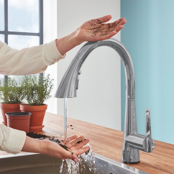 - Hygiënische activering door aanraking met onderarm, pols of handrug (GROHE EasyTouch)