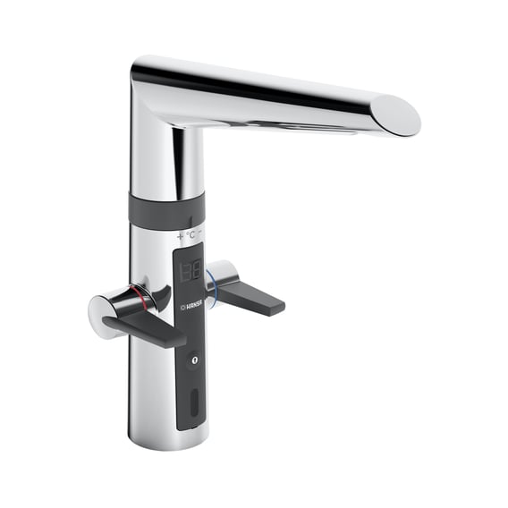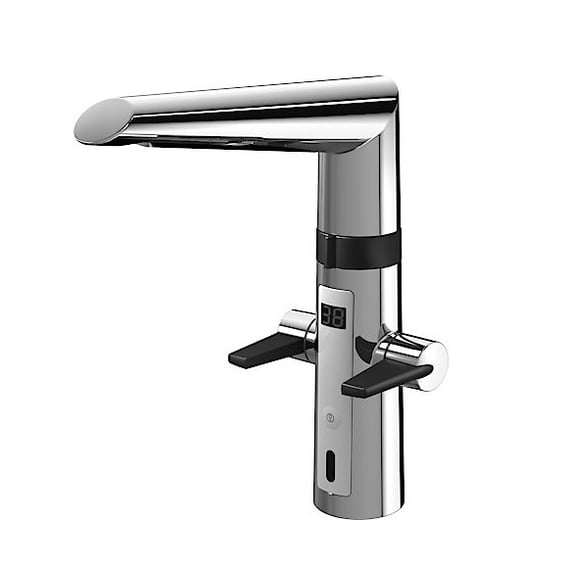 Deze Hansa Hansafit Hybride Elektronische Eenhendel Mengkraan – Draaibare Uitloop – Chroom 65232213 biedt een geavanceerde automatische activering met infrarood-elektronica. De watertemperatuur voor de contactloze functie kan eenvoudig worden ingesteld met een aparte draaiknop. De contactloze functie is desgewenst uitschakelbaar. Het temperatuurdisplay bevat een waarschuwing voor heet water, wat extra veiligheid biedt. De waterlooptijd is instelbaar, met een fabrieksinstelling van 40 seconden. Deze kraan is voorzien van een instelbare hygiënespoeling en een luchtinlaat voor een goed gevormde waterstraal. De soepel werkende zijventielen en de draaibare uitloop, die in drie standen instelbaar is (60°, 80° en 120°), maken deze kraan zeer gebruiksvriendelijk. Hij wordt geleverd met flexibele aansluitslangen en een stekkernetvoeding. De gescheiden, interne watergeleiding zorgt ervoor dat er geen contact is met nikkel en is vrijwel loodvrij (minder dan 0,3%).