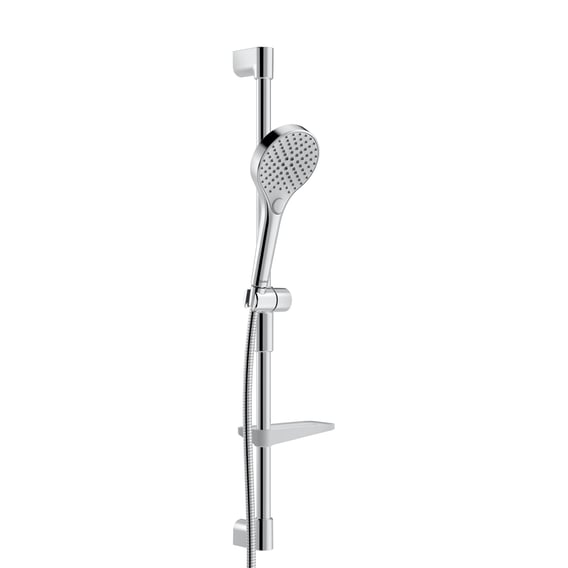Deze Hansa Viva glijstangset met garnituur biedt drie straalsoorten en is 766 mm lang in chroom. De handdouche heeft drie verschillende straalsoorten: regen voor een gelijkmatige, zachte straal, een massagestraal voor een intense, verkwikkende ervaring, en een normale straal die eveneens gelijkmatig en zacht is. De straalsoorten kunnen eenvoudig worden aangepast met een druk op de knop. Kalkafzettingen op de siliconen sproeiers kunnen gemakkelijk worden verwijderd door er licht overheen te wrijven. De set bevat een glijstang, een doucheslang en een schuif. De doucheslang heeft een lengte van 1750 mm en is knikbestendig, flexibel en eenvoudig te reinigen dankzij de Twist Guard technologie. De schuif is traploos in hoogte en helling verstelbaar voor de ideale positie van de handdouche. Bovendien is er een geïntegreerde zeepbakje als basis.
