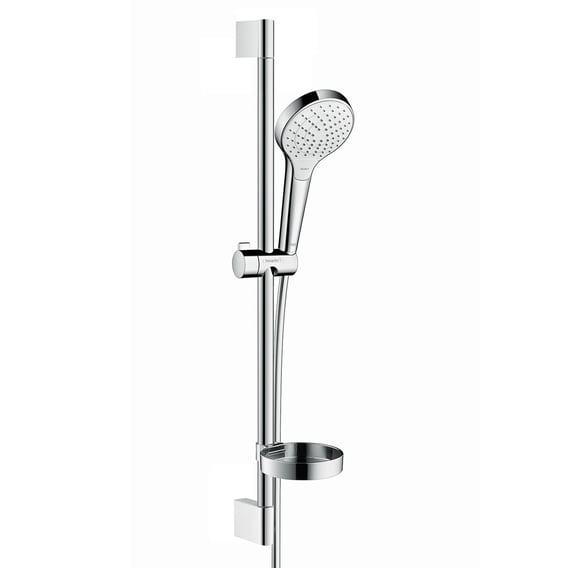 Deze Hansgrohe Croma Select S glijstangset met garnituur 3 straalsoorten 669 mm chroom 26566400 biedt een rijke douche-ervaring met drie verschillende straalsoorten. De handdouche heeft een diameter van 110 mm en biedt een gelijkmatige, zachte straal (Rain), een krachtige straal ideaal voor het wassen van haar (IntenseRain), en een extra krachtige straal (TurboRain). De straalsoorten kunnen eenvoudig worden aangepast met een druk op de knop dankzij de Select-functie. De grote douchekop zorgt voor een optimale waterverdeling, aangeduid als XXL Performance. Kalkafzettingen kunnen gemakkelijk worden verwijderd door simpelweg over de siliconen sproeiers te wrijven, dankzij de QuickClean-technologie. De handdouche kan in een hoek van 45° worden versteld voor een comfortabele douche-ervaring. De set bevat een Unica’Croma glijstang met een Isiflex doucheslang en een geïntegreerde zeepbakje Casetta’C. De doucheslang is knikbestendig, flexibel, eenvoudig te reinigen en voorzien van een verdraaiingsbescherming. De lengte van de doucheslang is 1600 mm en de hoogte van de glijstang is 669 mm, met een boorafstand van 625 mm. De diameter van de zeepbakje is 110 mm.
