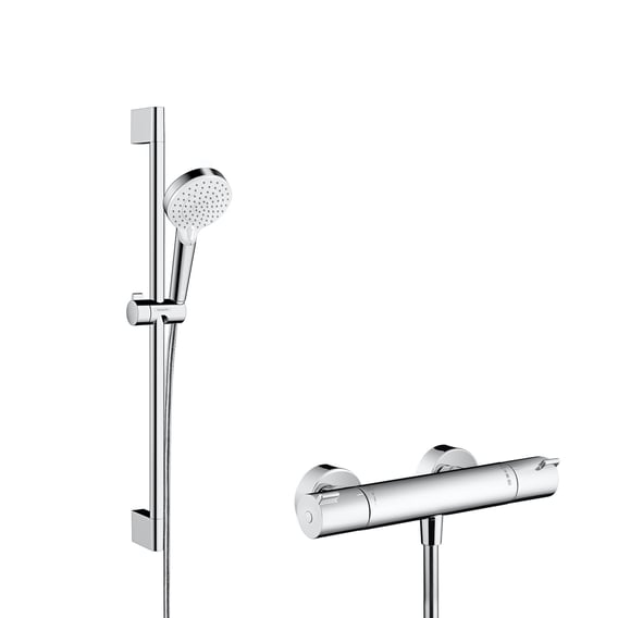 Deze Hansgrohe Crometta Vario thermostatische eengreeps mengkraan wandopbouw chroom 27812400 biedt een rijke douche-ervaring met zijn twee straalsoorten: Rain, een gelijkmatige en zachte straal, en IntenseRain, een krachtige straal die ideaal is voor het wassen van haar. De straalsoorten kunnen eenvoudig worden aangepast door aan de douchekop te draaien. De grote douchekop zorgt voor een optimale waterverdeling dankzij de XXL Performance. Kalkafzettingen op de siliconen sproeiers kunnen gemakkelijk worden verwijderd door erover te wrijven, dankzij de QuickClean-technologie. De schuif is verstelbaar in een hoek van 45 graden, en de douchekop heeft een diameter van 100 mm. De Unica Croma douchestang wordt geleverd met een Comfortflex doucheslang die knikbestendig, flexibel, gemakkelijk te reinigen en voorzien is van een verdraaiingsbescherming. De doucheslang heeft een lengte van 1600 mm en wordt geleverd met een verchroomde wandsteun van kunststof. Het opbouw-douchethermostaat Ecostat 1001 CL Combi activeert de handdouche door te draaien en biedt de mogelijkheid om de waterhoeveelheid te verminderen met een druk op de Ecostop-knop. De watertemperatuur blijft constant, zelfs bij schommelingen in de waterdruk, en een veiligheidsslot bij 40 °C beschermt tegen per ongeluk te hoge temperaturen. Het is mogelijk om een maximale temperatuur vooraf in te stellen met de Safety Function, en Hij is voorzien van een terugstroombeveiliging.