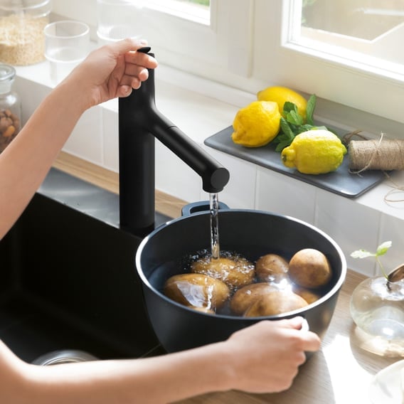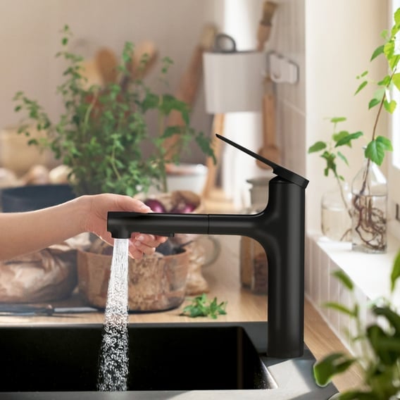 Deze Hansgrohe Zesis M33 keukenmengkraan 160 uittrekbaar mat-zwart 74822670 biedt een uitstekende combinatie van gebruiksvriendelijkheid en stijl. Hij beschikt over twee straalsoorten: een laminaire straal voor een gelijkmatige, heldere waterstroom en een douchestraal die water bespaart en krachtig genoeg is voor het afwassen van fruit en groenten. De straalsoorten kunnen eenvoudig worden gewisseld met een druk op de knop aan de uittrekbare sproeikop. De douchestraal kan worden vastgezet, waarbij de straal automatisch terugkeert naar de laminaire straal wanneer de waterstroom wordt gestopt. Kalkafzettingen op de siliconen sproeiers kunnen gemakkelijk worden verwijderd door erover te wrijven dankzij de QuickClean-technologie. Hij biedt verhoogd comfort door de soepele bedieningstechniek en de ruime afstand tussen de uitloop en de spoelbak, bekend als de ComfortZone. De magnetische sproeihouder (MagFit) zorgt voor een veilige bevestiging van de sproeikop. Hij is uitgerust met een QuickConnect-slang en een metalen uittrekbare sproeikop. De uitloop is uittrekbaar en kan worden gedraaid met een draaibereik van 150 graden. De keramische cartouche zorgt voor een soepele bediening en de temperatuur kan worden begrensd. Bovendien is Hij voorzien van een terugslagklep.