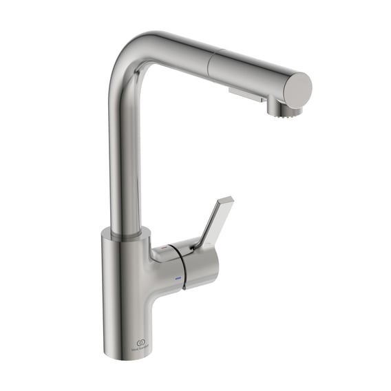Deze Ideal Standaard Gusto keukenmengkraan uitloop 2L-uitloop 2F-douche draaibaar uittrekbaar zilver storm BD420GN biedt een uitstekende combinatie van gebruiksvriendelijkheid en stijl voor elke moderne keuken. Hij beschikt over twee straalopties: een comfortabele straal die zacht en met lucht verrijkt is, en een douchestraal die waterbesparend en krachtig is, ideaal voor het afwassen van fruit en groenten. De straalopties kunnen eenvoudig worden aangepast door op de uitloop te drukken. De uittrekbare uitloop zorgt voor een comfortabele bediening en is draaibaar met een draaibereik van 360 graden. De uitloop is voorzien van een luchtinlaat voor een goed gevormde waterstraal. De bedieningshendel is gemaakt van metaal en heeft een permanente rood/blauwe markering. Het product wordt geleverd met een snelmontagesysteem (EASY-FIX) en kan van onderaf worden bevestigd met een schachtverbinding. Hij is uitgerust met een soepel werkende 28 mm keramische cartridge en heeft een geïntegreerde heetwatertemperatuurbegrenzer. Flexibele aansluitslangen en een geïntegreerd vetreservoir dat voedselveilig is, maken deze kraan tot een praktische keuze voor elke keuken.