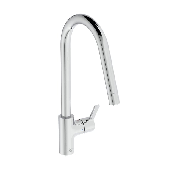 Deze IdeaLuxe Gusto keukenmengkraan uitloop 1-functie-sproeier laag druk rond draaibaar uittrekbaar chroom BD415AA biedt comfortabele bediening dankzij de uittrekbare uitloop. De uitloop is draaibaar met een zwenkbereik van 360 graden, wat zorgt voor maximale flexibiliteit in de keuken. Het product is voorzien van een snelmontagesysteem (EASY-FIX) voor eenvoudige installatie. De bedieningshendel is gemaakt van metaal en heeft een permanente rood/blauw markering voor eenvoudige temperatuurherkenning. Hij is uitgerust met een soepel werkende 28 mm keramische cartouche en een geïntegreerde heetwatertemperatuurbegrenzer voor extra veiligheid. Flexibele aansluitslangen en een geïntegreerd vetreservoir dat voedselveilig is, maken deze kraan een praktische en veilige keuze voor elke keuken.
