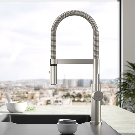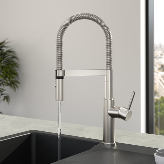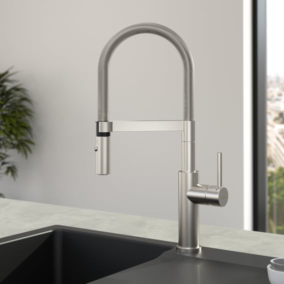 Deze Villeroy & Boch Steel Expert 20 eengreeps keukenmengkraan met veer uittrekbaar 2 standen edelstaal finish 928000LC biedt veelzijdige functionaliteit en een stijlvol ontwerp. Hij beschikt over twee straalopties: een comfortabele straal die zacht en met lucht verrijkt is, en een krachtige, waterbesparende straal voor het afspoelen van fruit en groenten. De straal kan eenvoudig worden aangepast door op de sproeikop te drukken. Dankzij de geheugenfunctie start Hij met de laatst gebruikte straaloptie. De ingebouwde luchtinlaat zorgt voor een goed gevormde waterstraal, en kalkaanslag kan eenvoudig worden verwijderd door licht te wrijven. De uitloop is draaibaar met een bereik van 360°, wat handig is voor het vullen van hoge vaten. Een magneet zorgt voor een gemakkelijke terugkeer van de sproeikop naar de uitloop. Hij is uitgerust met een soepele keramische cartouche, flexibele aansluitslangen en een terugslagklep.