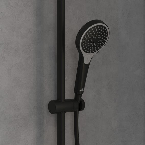 Deze Villeroy & Boch Verve Showers thermostatische opbouw regendoucheset Ø250 mm mat-zwart TVS109005000K5 biedt een uitbundige douche-ervaring met zijn regenachtige, zachte waterstraal die verrijkt is met lucht voor een volle en aangename douche. Dankzij de EasyClean-functie kunnen kalkafzettingen eenvoudig worden verwijderd door licht te wrijven over de luchtinlaat. De hoofddouche is individueel verstelbaar dankzij het kogelgewricht, wat zorgt voor een ideale positionering. De handdouche wordt geleverd met een doucheslang en schuifregelaar en biedt drie straalopties: een ontspannende, zachte straal, een krachtige straal ideaal voor het wassen van haar, en een intensieve, verkwikkende massagestraal. Met de EasySwitch-functie kan eenvoudig tussen de straalopties worden gewisseld. De doucheslang is knikbestendig, flexibel, gemakkelijk schoon te maken en voorzien van een draaibescherming. De schuifregelaar is traploos in hoogte en hoek verstelbaar voor de ideale positie van de handdouche. De thermostaatkraan is geschikt voor twee gebruikers en maakt het mogelijk om eenvoudig te schakelen tussen de hoofddouche en handdouche. De constante watertemperatuur wordt gehandhaafd, zelfs bij wisselende waterdruk, en de veiligheidsslot bij 38 °C beschermt tegen per ongeluk te hete temperaturen. Het veiligheidsomhulsel met interne watergeleiding (CoolTap) voorkomt verbrandingsgevaar.